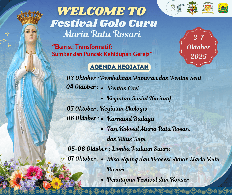 KEUSKUPANRUTENG.ORG – Festival Golo Curu “Bunda Maria Ratu Rosari” untuk ke-4 kalinya akan diselenggarakan di Ruteng 3-7 Oktober 2025. Festival tahunan yang bernuansa religi, budaya,…