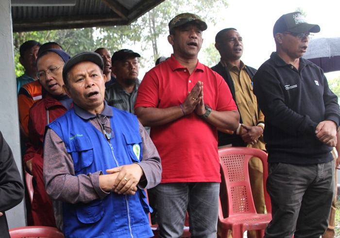 Vikaris Jenderal Keuskupan Ruteng, RD Sebastianus Hobahana, SVD (mengenakan rompi biru), Bupati Manggarai, Herybertus G. L Nabit (tengah, berbaju merah) dan Ketua DPRD Kabupaten Manggarai, Paulus Peos bersama ratusan orang lainnya saat mengikuti Ibadat Ekologis dan Aksi Penghijauan di Bukit Golo Lusang, Senin, 14 Juli 2025 merayakan Lustrum Mgr. Siprianus Hormat. (Foto : KEUSKUPANRUTENG.ORG)