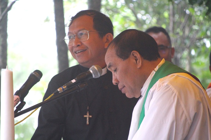 Uskup Ruteng, Mgr Siprianus Hormat dan Direktur Pusat Pastoral (PUSPAS) Keuskupan Ruteng, RD Dr. Martin Chen saat Ibadat Ekologis dan Aksi Penghijauan di Bukit Golo Lusang dalam rangka mengisi perayaan pastoral Lustrum Mgr Siprianus, Senin, 14 Juli 2025 pagi. (Foto : KEUSKUPAN RUTENG.ORG)