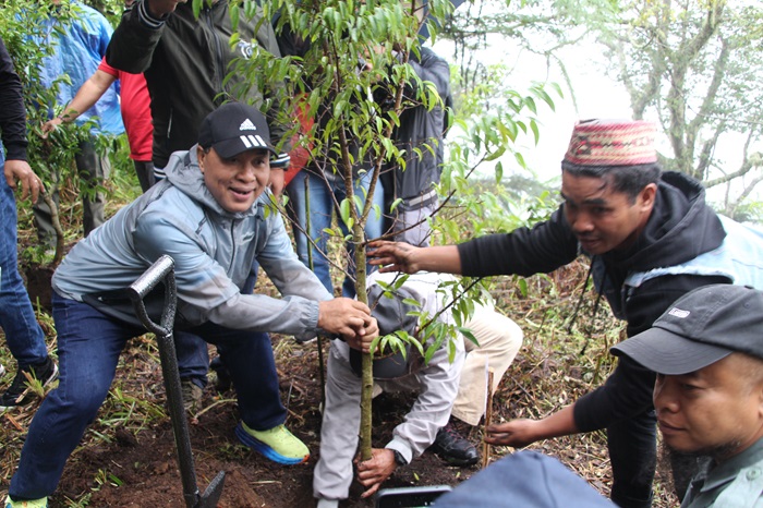 Uskup Ruteng, Mgr Siprianus Hormat saat melakukan penanaman pohon yang dikenang sebagai “Pohon Lustrum” dalam kegiatan Misa Ekologis dan Aksi Penghijauan di Bukit Golo Lusang, Senin, 14 Juli 2025. Kegiatan ini menjadi rangkaian acara dalam rangka merayakan Lustrum Mgr Siprianus. Semua orang yang menghadiri kegiatan ini juga melakukan penanaman pohon untuk menjaga kelestarian hutan kawasan ini. (Foto : KEUSKUPANRUTENG.ORG)