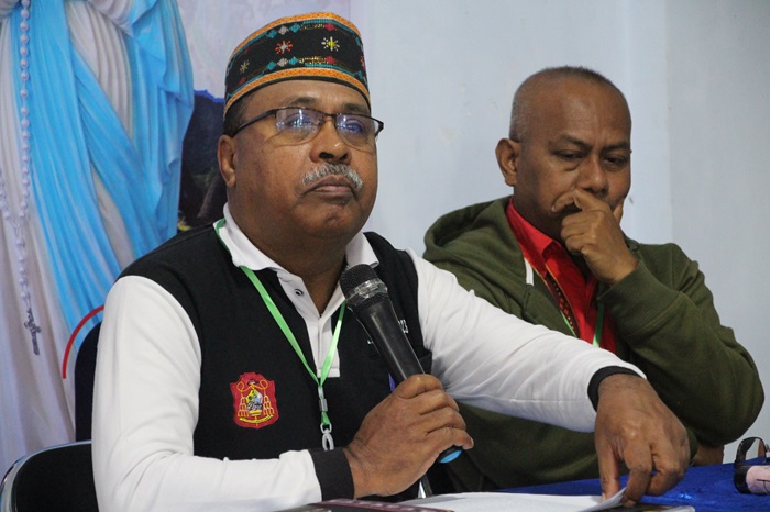 Ketua Umum Panitia Festival Golo Curu 2025 Yosefus Nono, dan Ketua Pelaksana RD Ignasius F. R. Bora saat acara jumpa pers dengan wartawan media cetak, online dan televisi di Aula Pusat Pastoral (PUSPAS) Keuskupan Ruteng, Selasa, 30 September 2025 dalam rangka Festival Golo Curu 3-7 Oktober 2025. (Foto : SASHA/KEUSKUANRUTENG.ORG)