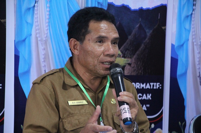 Kepala Dinas Pariwisata dan Kebudayaan Kabupaten Manggarai, Aloysius Jebarut saat berbicara dalam kegiatan konferensi pers menyongsong Festival Golo Curu 2025 yang diadakan di Aula Gedung Pusat Pastoral Keuskupan Ruteng, Selasa, 30 September 2025 pagi. (Foto : SASHA/ KEUSKUPANRUTENG.ORG)