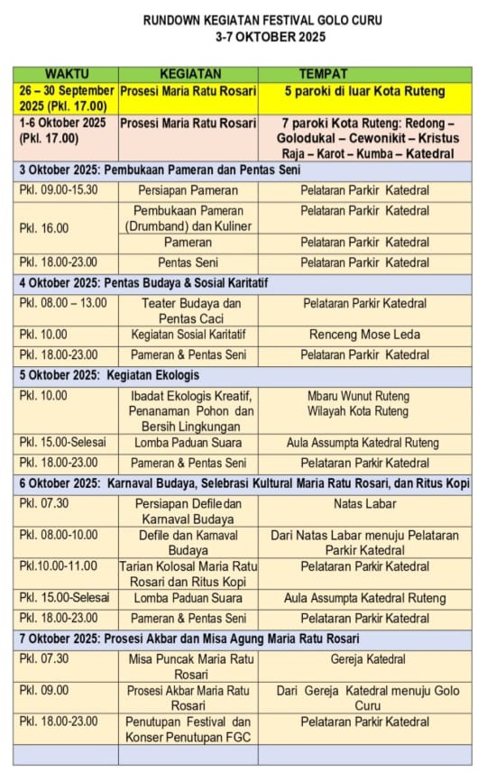 KEUSKUPANRUTENG.ORG – Festival Golo Curu “Bunda Maria Ratu Rosari” untuk ke-4 kalinya akan diselenggarakan di Ruteng 3-7 Oktober 2025. Festival tahunan yang bernuansa religi, budaya, dan pariwisata ini telah menjadi daya tarik terutama sebagai kegiatan spiritual yang memperteguh dan merayakan iman umat kepada Yesus Kristus Sang Penebus melalui Bunda-Nya Perawan Maria.