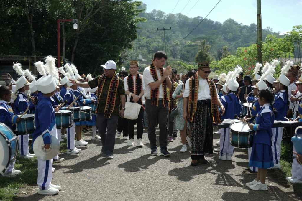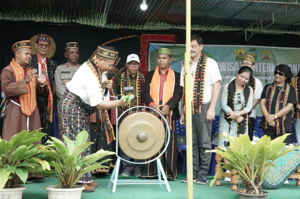 Vikaris Jenderal Keuskupan Ruteng, RP Sebastian Hobahana, SVD saat memukul gong yang menandai resmi dimulainya perayaan Hari Pariwisata Internasional di Paroki Kristus Raja Pagal, Sabtu, 20 September 2025. Perayaan ini mengusung tagline Tourism and Sustainable Transformation. (Foto : SASHA/KEUSKUPANRUTENG.ORG)