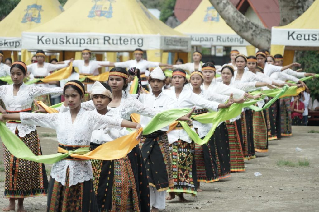 Atraksi tari-tarian tradisional Manggarai oleh para pelajar yang dipentaskan saat acara pembukaan Hari Pariwisata Internasional 2025 di Paroki Kristus Raja, Pagal. Dengan menggunakan kostum tradisional para pelajar membawakan rangkaian tarian yang memeriahkan acara tersebut. (Foto : SASHA/KEUSKUPANRUTENG.ORG)