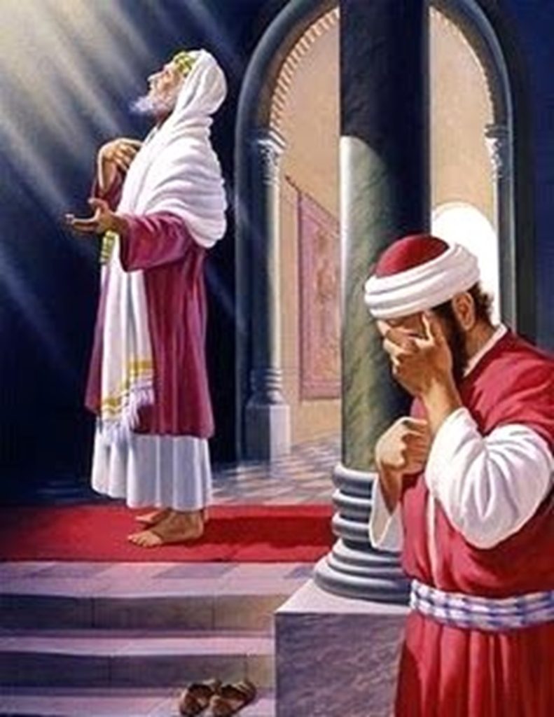 Sebaliknya yang terjadi dengan si Pemungut Cukai. Dia sungguh merasakan kerapuhan, dan kelemahan dirinya. Dia sungguh mengakui kehinaan dirinya di hadapan Allah. Dan karena itu dia “tak berani menengadah ke langit”. Dia bahkan juga takut dekat dekat dengan si Farisi yang “alim” itu. Injil melukiskan dengan pilu: Dia berdiri jauh jauh dan sambil memukul dirinya, dia hanya bisa menunduk dan berseru lirih, “Allah, kasihanilah aku orang berdosa ini!” (Luk 18:13).