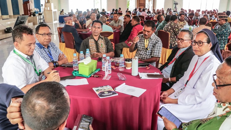 Diskusi kelompok para peserta Sidang Sinode IV Sesi I di Rumah Retret Wae Lengkas. Semua peserta duduk di setiap meja bundar sejumlah 24 meja. Mereka saling sharing dan memberikan pendapat/pikiran atas sejumlah tema. (Foto : KOMSOS KR)