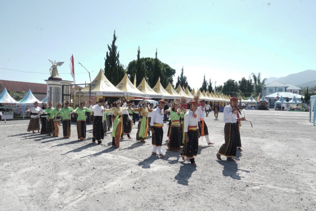 Sanggar Seni Lando Uwa UNIKA St. Paulus Ruteng dan SMPN 1 Langke Rembong saat menampilkan karong woja wole di pelataran gereja Katedral pada Sabtu 4 Oktober pagi. (KOMSOS KR)