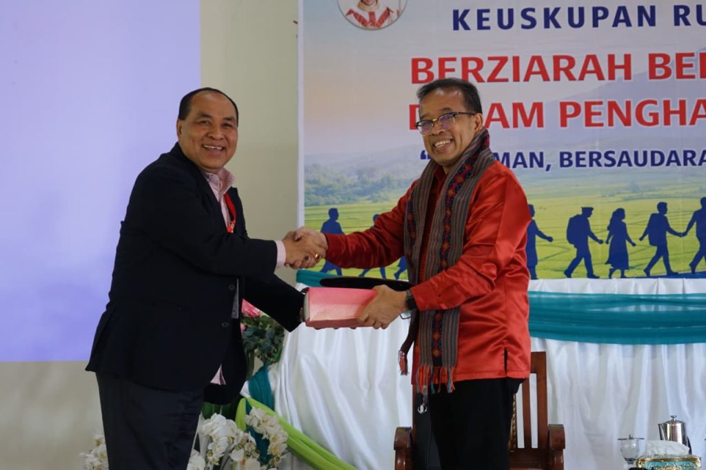 Uskup Keuskupan Ruteng Mgr. Siprianus Hormat saat menyerahkan cinderamata kepada RP Haryatmoko, SJ sesusai ia mempresentasikan materinya di Sidang Sinode IV Sesi II, Selasa, 14 April 2026. (Foto: KOMSOS KR)