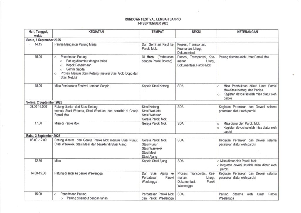 Rundown Festival Lembah Sanpio 2025 By sasha claudia on September 3, 2025 4:50 am Berikut adalah Rundown kegiatan Festival Lembah Sanpio 2025: Published in Informasi Pastoral festival lembah sanpio sasha claudia