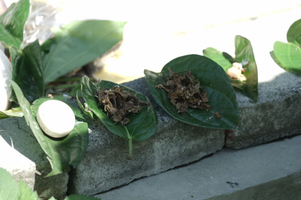Wua Lime atau buah tangan sebagai simbol ungkapan hati berupa telur, sirih pinang, dan tembakau yang digunakan sebagai simbol penghormatan saat ritus Tesi yang dilaksanakan oleh Panitia Festival Golo Curu di kompleks pemakaman para uskup yang pernah berkarya di Keuskupan Ruteng, Rabu, 1 Oktober 2025. (Foto : SASHA/KEUSKUPANRUTENG.ORG)