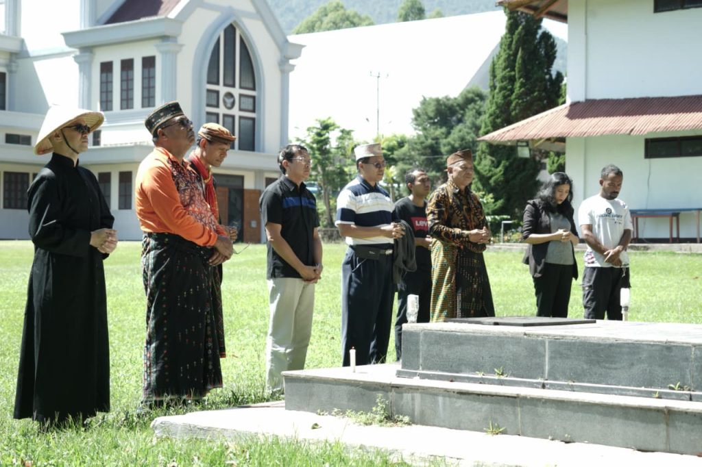 Suasana saat dilaksanakannya acara ritus adat Tesi di makam para uskup yang terletak di sisi barat Gereja Katedral Ruteng, Rabu, 1 Oktober 2025 pagi. Tampak Panitia Festival Golo Curu “Maria Ratu Rosari” saat berdiri di depan jejeran makam para uskup. (Foto : SASHA/KEUSKUPANRUTENG.ORG)